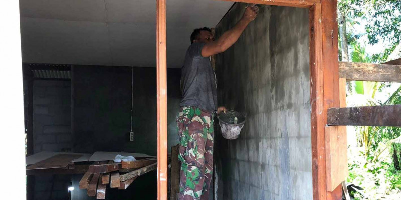 Anggota Satgas TMMD 117 Kodim 1708/BN Sertu Kristanto Fajar mengerjakan pengacian dinding rumah milik ibu Ida Natalia Rumaropen