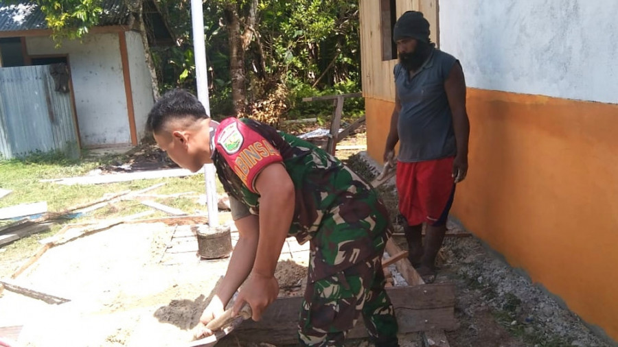 ASKARA – Babinsa Koramil 1708-06-Supiori Utara Serda Suyuti kerja bakti dalam rehabilitas Kantor Klasis Kampung Warbor, Distrik Supiori Utara, Kabupaten Supiori, Papua, Sabtu (19/8).