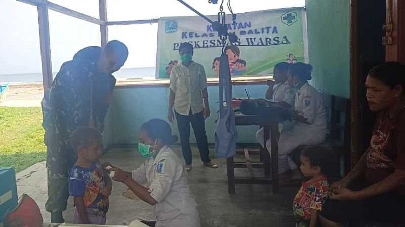 ASKARA – Babinsa Posramil 1708-02/Biak Utara-Warsa, Sertu Abdullah melaksanakan pendampingan pos pelayanan terpadu (posyandu) di Balai Pustu Kampung Amoi, Distrik Warsa, Kabupaten Biak Mumfor, Papua, Selasa (22/8).