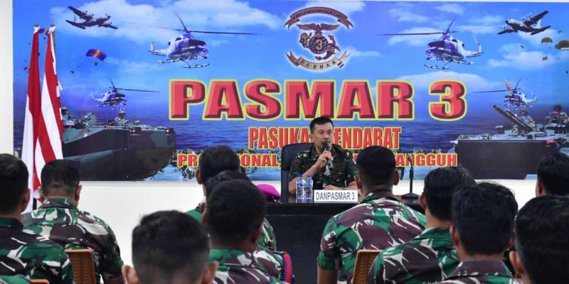ASKARA – Komandan Pasmar 3 Brigjen TNI (Mar) Sugianto, S.Sos., memberikan pengarahan kepada seluruh personel Intelijen Pasmar 3 terkait tugas pokok, fungsi dan peran Intelijen Pasmar 3 di ruang rapat Mako Pasmar 3, Jl. Sorong-Klamono, Km. 16, Distrik Klaurung, Kota Sorong, Papua Barat Daya.