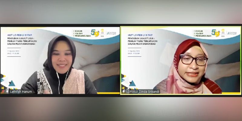 Dekan Fakultas Ekonomi dan Bisnis Universitas Indonesia, Teguh Dartanto, Ph.D., membuka agenda ini dengan menyoroti penuaan penduduk Indonesia pada 2025 (berdasarkan Sensus Penduduk 2020). Dalam menghadapi Pesta Demokrasi, Indonesia perlu memastikan fasilitas yang memadai bagi partisipasi pemilih dalam Pemilu. Kontestan Pemilu harus melihat pemilih lansia lebih dari sekadar suara dan mencari solusi kebijakan pro-lansia. Dipandu oleh Dinda S. Radjiman, S.K.M., M.Si. dari Lembaga Demografi FEB UI, webinar ini menelaah kondisi demografis dan karakteristik psikologis pemilih lansia. Persiapan infrastruktur dan fasilitas untuk pemilu yang ramah lansia juga dibahas, sambil mempersiapkan lansia untuk partisipasi politis dalam pemilu berintegritas.