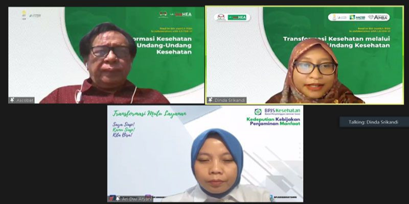 Webinar juga dihadiri oleh Deputi Bidang Kebijakan Penjaminan Manfaat (KPM) BPJS Kesehatan, dr. Ari Dwi Aryani, M.KM, AAK. Paparan dr. Ari Dwi Aryani menjelaskan transformasi kesehatan dan peran program JKN pasca pandemi yang dilakukan BPJS Kesehatan. BPJS kesehatan dan seluruh jajaran di fasilitas kesehatan berkomitmen untuk membangun sistem pelayanan kesehatan yang aksesibel, meyeluruh, terjangkau, dan berkulitas. Kemudahan akses layanan JKN di fasilitas kesehatan terwujud dengan adanya antrean online, display informasi, digital validation, simplifikasi layanan, telemedisin, dan i-care JKN. Selain itu, BPJS Kesehatan juga tengah berupaya melakukan penguatan fungsi promotif preventif dan terus menjaga keberlangsungan program jaminan kesehatan di Indoesia. Tidak ada keadilan sosial tanpa kesejahteraan sosial dan tidak ada kesejahteraan sosial tanpa ada jaminan sosial ucap dr. Ari Dwi Aryani.
