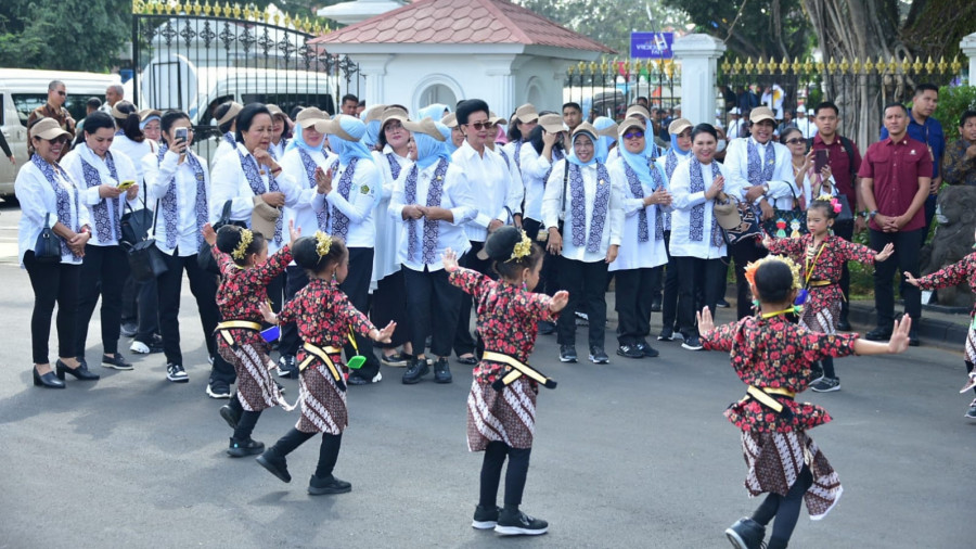 ASKARA – Penasihat Dharma Wanita Persatuan (DWP) Kementerian Pekerjaan Umum dan Perumahan Rakyat (PUPR) Kartika Basuki Hadimuljono bersama pengurus Organisasi Aksi Solidaritas Era Kabinet Indonesia Maju (OASE KIM) mendampingi Ibu Negara Iriana Joko Widodo mengikuti acara bermain bersama para siswa Taman Kanak-Kanak (TK) dan Sekolah Dasar (SD) di Istana Kepresidenan Yogyakarta, Selasa (19/9/2023). Kegiatan ini sekaligus mensosialisasikan gerakan Cuci Tangan Pakai Sabun (CTPS) dengan dukungan sarana dari Kementerian PUPR.